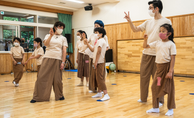 The stage and audience were set up in the gymnasium (arena) in the plaza, and the children performed the dances they had learned one by one with their instructors, inviting their parents and other related people to join the audience. At the beginning of the performance, the children used sign language to express the title, "Minato-ku Choju-Giga".