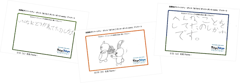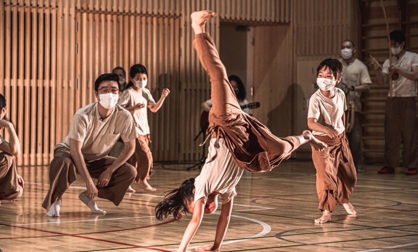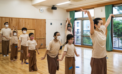 Mikico Suto, who took over from Mari Fukutome, served as the facilitator, and the children learned the rudiments of capoeira from Ryu, flamenco from Sayaka, sign language from lzumi, classical Chinese dance from Lei Huang, and classical Japanese dance from Kikunojo. Lei, who was making her first appearance in the program, taught them how to move fluidly while being conscious of their breathing, in contrast to other dances that are based on rhythm. Furthermore, Kikunojo's idea was to use Choju-Giga (Scrolls of Frolicking Animals) as the overall motif of the showing, so the children also learned the movements of animals in each dance (bull in flamenco, monkey and frog in capoeira, bird in classical Chinese dance, and rabbit and raccoon in classical Japanese dance).