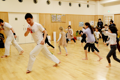 Capoeira, taught by Ryu Shirahase, is a traditional Brazilian culture that is a mixture of dance and martial arts. After learning the basic techniques, we tried roda, which is a one-on-one exchange of moves in a circle to the rhythm of a single string percussion instrument called berimbau.