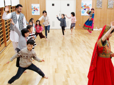 Ashraf Baburi of the Embassy of Afghanistan, saying at first that he was not a good dancer, taught us a folk dance called attan, which resembles bon dance, wearing a neat traditional costume. Nanako Kamimura,the leader of the Afghan dance group "Sharan Sharan", also demonstrated the beautiful female dance for us. Their gorgeous costumes were very popular among the children, who lined up for photos after the workshop.