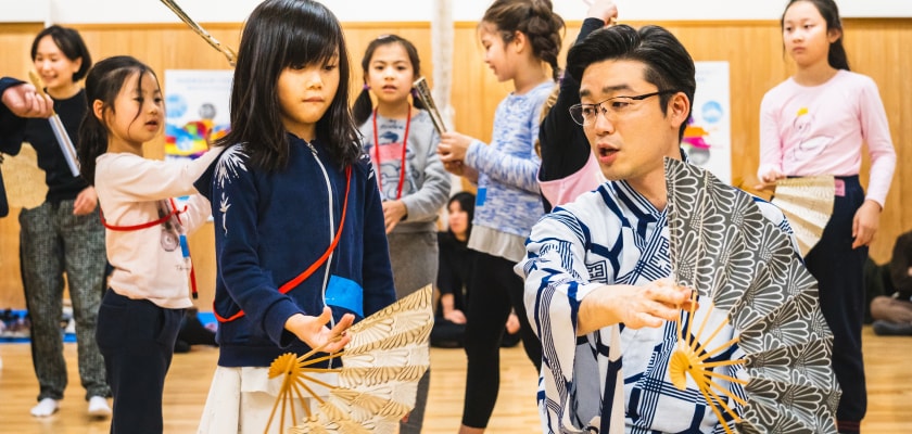 The classical Japanese dance workshop was conducted by Kikunojo Onoe, the iemoto of the Onoe school. Wearing tabi (split-toed socks), the children learned how to greet each other, how to handle a fan, and how to behave and prepare for the dance. Kikunojo's graceful and delicate attitude seemed directly touching the children. In classical Japanese dance, gestures are used to express meanings, which are then combined to act out a story. The children enjoyed expressing "snow falling" and "wind blowing" with a fan and experienced Japanese traditional culture and aesthetic sense.