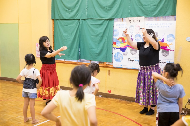 児童館でフラを教えているロケラニ和子さんには、基本のステップや、手で様々な形や風景を表現する動きを教えて頂いた。ロケラニ和子さんは地元のハワイアン・バンド「ブルー・パラダイス」とも活動を共にしており、日の出町のハワイアンシーンの一端も垣間見られた。